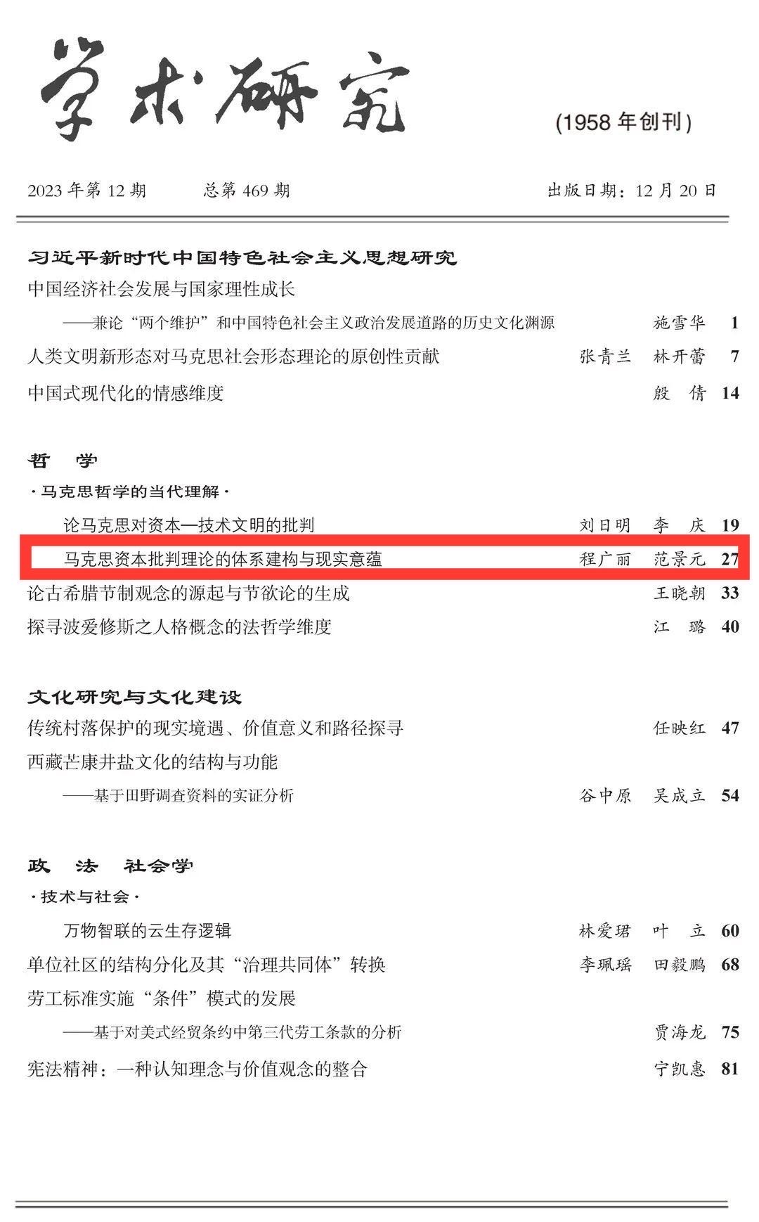 近日,我院程广丽教授、范景元老师在《学术研究》(CSSCI来源期刊/北大核心)(2023年第12期)发表学术论文《马克思资本批判理论的体系建构与现实意蕴》。文章指出:马克思的资本批判理论有着特定的出场语境、体系建构与现实意蕴。马克思以资本为基点的政治经济学批判,是对古典政治经济学家将资本物化、量化的经济学解读方式的扬弃和超越。马克思从分析资本的内涵和本质为逻辑起点,围绕着资本的产生过程、运行机制及发展趋势,运用唯物史观的方法论,将政治经济学批判与科学社会主义理论内在地统一起来,凸显出科学性与批判性的辩证统一,表现出批判的和革命的价值立场。当代中国共产党人继承和发展了马克思资本批判理论,从而为社会主义市场经济健康发展提供了重要的理论基础与价值支撑。