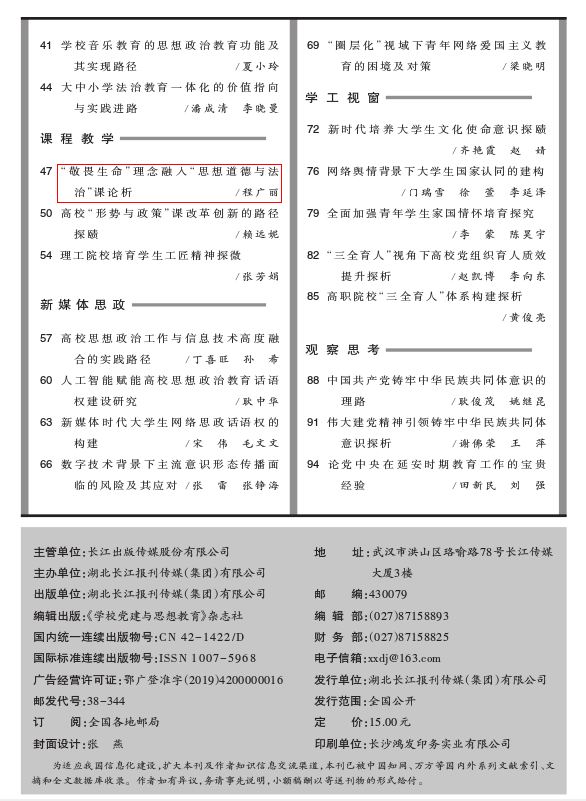 近日,我院程广丽教授在《学校党建与思想教育》(CSSCI扩展版来源期刊/北大核心)(2024年第12期)发表学术论文《“敬畏生命”理念融入“思想道德与法治”课论析》。文章认为:作为落实高校立德树人根本任务的关键课程之一,“思想道德与法治”课在帮助大学生树立正确的人生观、价值观以及生命观上,起着极其重要的作用。将“敬畏生命”理念贯彻到“思想道德与法治”课当中,遵循政治性与思想性相统一、理论性与实践性相统一、知识性与价值性相统一的原则,运用辩证思维把握“敬畏生命”的思想内涵,运用系统思维把握“敬畏生命”的核心要义,运用历史思维把握“敬畏生命”的现实意义,从而积极回应大学生在成长过程中的各种困惑和价值诉求,引领他们树立马克思主义生命观,具有重要的理论意义和现实价值。