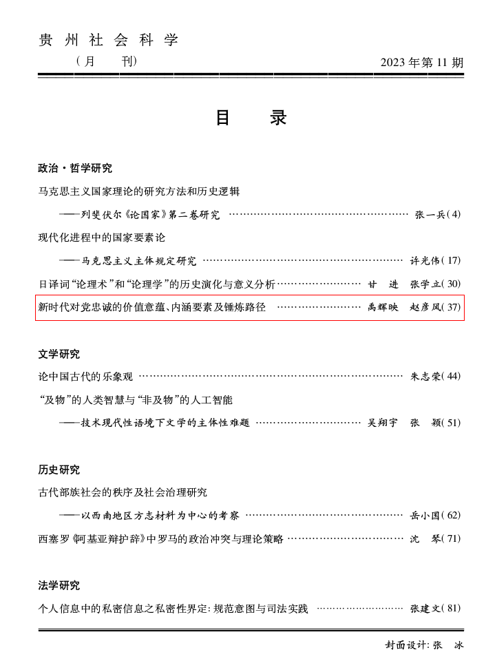 近日,我院禹辉映、赵彦风老师在《贵州社会科学》(CSSCI来源期刊/北大核心)(2023年第11期)发表学术论文《新时代对党忠诚的价值意蕴、内涵要素及锤炼路径》。文章指出:“心中有党、对党忠诚”,这是党对全体党员的政治要求。党的十八大以来,习近平总书记围绕对党忠诚主题发表了一系列重要讲话,回答了新时代对党忠诚的一系列理论和实践问题。对党忠诚极端重要,是中国共产党一以贯之的政治要求、是战胜任何困难和敌人的重要依靠。对党是否忠诚是党内所有的政治问题的根本。对党忠诚不仅有党员义务、政治品质的含义,同时还有具体行动的指向。党员特别是党员领导干部都必须做到始终忠诚于党,必须体现在对党的信仰、组织、理论和路线方针政策忠诚上,做到忠诚于党、忠诚于人民的有机统一。党员领导干部锤炼对党忠诚政治品质,必须筑牢理想信念根基、加强对党忠诚教育、涵养对党忠诚文化、自觉加强政治历练。