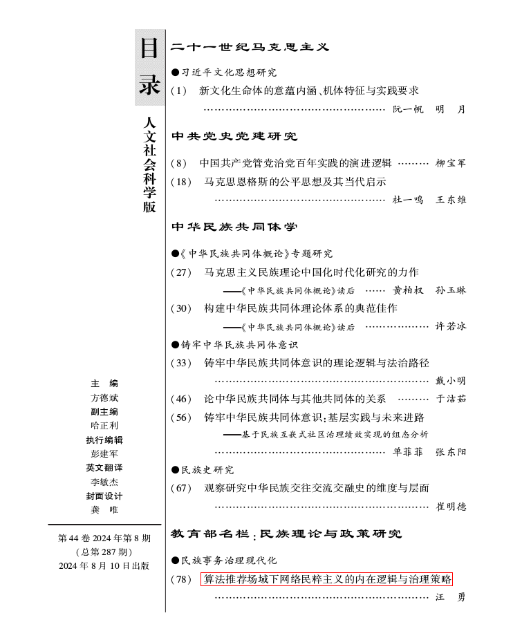 近日,我院汪勇博士在《中南民族大学学报(人文社会科学版)》(CSSCI来源期刊/北大核心)(2024年第8期)发表学术论文《算法推荐场域下网络民粹主义的内在逻辑与治理策略》。文章认为:算法推荐以精准化特性普遍应用于网络空间,成为网络民粹主义生发的运行底色。网络民粹主义借算法推荐的技术赋权,利用网民的从众心理引导底层民众进行民粹主义的网络聚集、发酵和外溢,加剧了民粹主义的生发频率和影响范围,给我国网络生态和社会稳定带来了严重安全隐患。为此,基于技术、心理、实践等维度的逻辑分析,以价值引领、技术改进、素养提高、法治规制、社会公正来实施对网络民粹主义的全面治理,实现技术逻辑与价值逻辑的融合统一,并通过驾驭算法推荐破除网络民粹主义的生成,维护好风清气正的网络生态和团结稳定的社会环境。