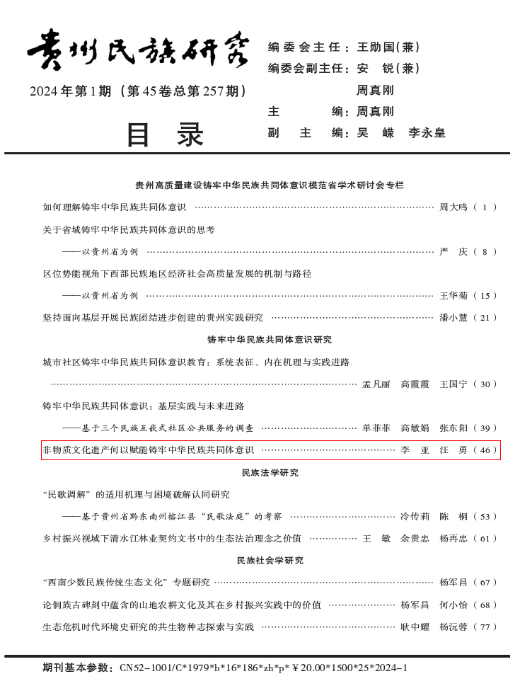 近日,我院李亚老师在《贵州民族研究》(CSSCI来源期刊/北大核心)(2024年第1期)发表学术论文《非物质文化遗产何以赋能铸牢中华民族共同体意识》。文章认为:中国非物质文化遗产是中国各族人民在中华民族多元一体格局下、在长期的历史发展过程中相互作用、相互学习借鉴、相互认同累积形成而又保留各自民族特色的传统文化表现形式及其相关的实物和场所,其中蕴藏着十分丰富的中华民族共同体意识的基因,是铸牢中华民族共同体意识的宝贵资源。中国非物质文化遗产以其承载的共同记忆、共同情感、共同精神,为铸牢中华民族共同体意识奠定了基础;通过唤醒共同身份、强化共同思想、凝聚共同力量,为铸牢中华民族共同体意识提供了方案;凭借其有形载体、有感方式、有效成果,为铸牢中华民族共同体意识指明了路径。