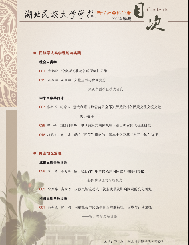 近日,我院张振兴博士、杨璨玉老师在《湖北民族大学学报(哲学社会科学版)》(CSSCI扩展版来源期刊/北大核心)(2023年第6期)发表学术论文“意大利藏《黔省苗图全部》所见贵州各民族交往交流交融史事述评”。文章认为:意大利社会地理学会图书馆藏《黔省苗图全部》是一部文本相对完整、装帧自成体系、收藏状况良好的晚期“百苗图”抄临本。此图册较此前所见“百苗图”诸抄临本,明显具有与时俱进、反映清末至民国初年时代巨变之特征,呈现“文古图今”这一编修特色。通过选取内中反映贵州各民族交往交流交融史事的代表性绘图,展开考论结合的研究,可望从中发现清末民初贵州各民族交往交流交融实情,为认识和了解19世纪末20世纪初中华民族文化事项共有共享提供形象具体的佐证,并可为当下中国铸牢中华民族共同体意识提供来自历史的支撑。