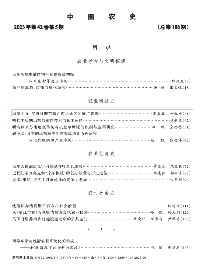 近日,我院李鑫鑫博士和南京审计大学何红中博士在《中国农史》(CSSCI来源期刊/北大核心)(2023年第5期)发表学术论文《国家主导:汉唐时期苜蓿在西北地区的推广管理》。文章认为:作为重要牧草,苜蓿自引种中原后,汉唐王朝十分重视它的推广种植与系统管理。在汉廷主导下,苜蓿逐步从关中推广至北方各边郡。悬泉汉简不仅保留了当时购买使用苜蓿的记录,还显示当地存在征缴、储藏与巡查苜蓿的管理活动。魏晋时期,苜蓿已广泛种植于天山南北,吐鲁番文书等材料显示人们格外关注苜蓿的生长与收获,此外苜蓿还是西域各国廪给、税收与劳役征发的重要对象。唐代,伴随着驿传交通建设,唐王朝对苜蓿种植、配给、使用的管理已形成一定制度。开元年间,西至吐鲁番,东至关中的西北各地都种植着一定面积的苜蓿。汉唐时期苜蓿在西北地区的推广种植与系统管理对“汉唐气象”的生成,以及我国农牧业发展均产生了重要影响。