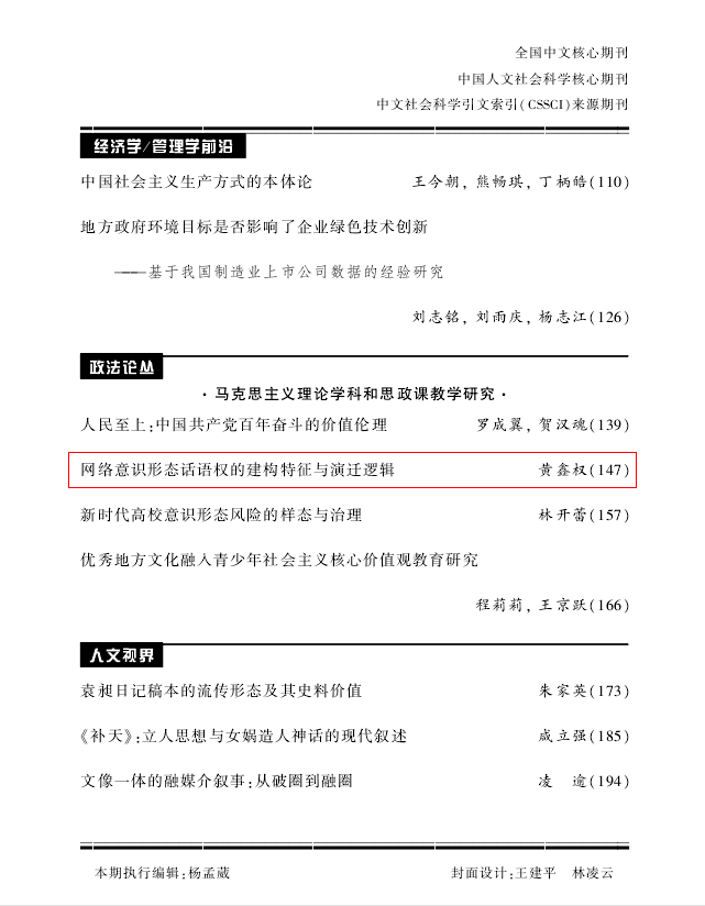 2022年10月,我院党委书记黄鑫权博士在《华南师范大学学报(社会科学版)》(CSSCI来源期刊/北大核心)(2024年第5期)发表学术论文《网络意识形态话语权的建构特征与演迁逻辑》。文章认为:在信息技术日趋发达和移动自媒体迅速发展的新时代,网络空间成为话语权利和话语权力争夺的主战场和主阵地。“现实、实体、线下”维度的传统意识形态话语权建构模式逐渐演迁为“线上线下、实体互动、现实虚拟”维度的现代网络意识形态话语权治理模式。从话语主体模式的转型、话语客体状态的转变、话语空间建构的转换三重维度深刻把握网络意识形态话语权建构的演迁逻辑,对有效防范和化解网络意识形态领域的主要风险点、不断提升新时代网络意识形态话语权具有重要意义。