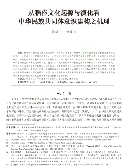 2025年7月,我院张振兴博士在《云南社会科学》(CSSCI来源期刊/北大核心)(2025年第4期)发表学术论文《从稻作文化起源与演化看中华民族共同体意识建构之机理》。文章认为:稻作文化的起源与演化是历史学、民族学、考古学、地理学、农学等诸领域学者长期关注的热点问题之一。学者们关注与讨论的焦点之一,是此项文化的起源及定型是借助特定技术或社会环境的助推得以确立,抑或是众多技术叠加与多元文化制衡互动作用才得以实现。针对上述久议难决之困惑,可以从野生稻到栽培稻转变的三大挑战分析入手,澄清人类实现水稻规模化种植需克服技术与社会条件多样并存的情况。远古以来生活在中国南方丘陵山区诸多民众,正是凭借多元文化互动制衡实现稻作文化起源之突破,并在其后的历史进程中,借助统一的多民族国家政权的干预,最终达成稻作文化之成熟及繁荣兴盛。通过对中国稻作文化起源与演化的历史进程进行梳理,有助于揭示中华民族共同体意识建构的机理,为当下铸牢中华民族共同体意识与构筑中华民族共有精神家园提供有益的支撑。