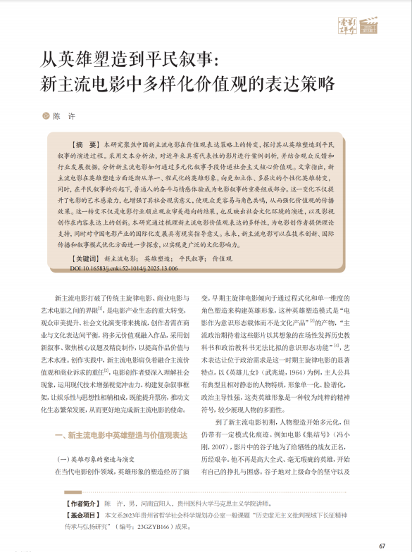 2025年7月,我院陈许老师在《电影评介》(北大核心)(2025年第13期)发表学术论文《从英雄塑造到平民叙事:新主流电影中多样化价值观的表达策略》。文章认为:新主流电影在英雄塑造方面逐渐从单一、程式化的英雄形象,向更加立体、多层次的个性化英雄转变,同时,在平民叙事的兴起下,普通人的奋斗与情感体验成为电影叙事的重要组成部分。这一变化不仅提升了电影的艺术感染力,也增强了其社会现实意义,使观众更容易与角色共鸣,从而强化价值观的传播效果。这一转变不仅是电影行业顺应观众审美趋向的结果,也反映出社会文化环境的演进,以及影视创作在内容表达上的创新。