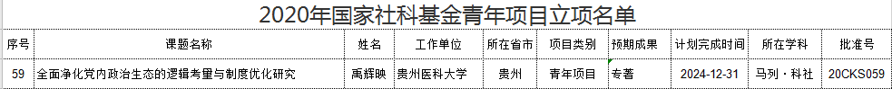 9月27日,全国哲学社会科学工作办公室公布了2020年国家社科基金年度项目和青年项目立项结果的通知。该通知显示,今年立项课题为4625项,其中重点项目363项,一般项目3184项,青年项目1078项。我院教师禹辉映申报的“全面净化党内政治生态的逻辑考量与制度优化研究”(所在学科:马列·科社;项目类别:青年项目;批准号:20CKS059)项目获批正式立项。这是继禹辉映老师获批2019年度教育部人文社会科学研究青年基金项目后的新突破,也是马克思主义学院科研项目获批级别的新突破。