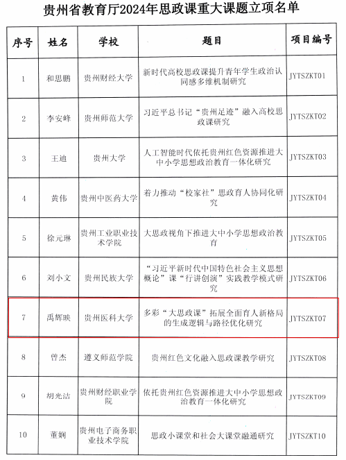 11月6日,省教育厅下发了《省教育厅办公室关于公布贵州省教育厅2024年思政课重大课题评审结果的通知》,我院副院长禹辉映申报的《多彩“大思政课”拓展全面育人新格局的生成逻辑与路径优化研究》获批立项。