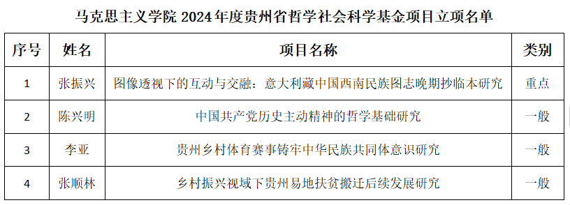 近日,贵州省社科办公示了2024年度贵州省哲学社会科学基金项目立项名单,我院获批重点项目1项、一般项目3项。分别是:张振兴的“图像透视下的互动与交融:意大利藏中国西南民族图志晚期抄临本研究”、陈兴明的“中国共产党历史主动精神的哲学基础研究”、李亚的“贵州乡村体育赛事铸牢中华民族共同体意识研究”、张顺林的“乡村振兴视域下贵州易地扶贫搬迁后续发展研究”。立项数再次取得了好成绩。