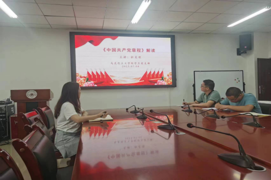 为深入学习贯彻党的二十大精神,深刻领会党章修正案的主要内容,进一步提升党员的党性修养,7月4日,学院学生党支部书记杜美瑾以“《中国共产党章程》解读”为题讲授党课,支部成员黄连舟、马景瑶参加。