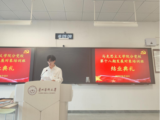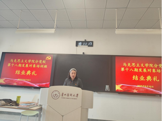 6月12日,学院分党校在善思楼R101教室举行第18期入党积极分子培训班结业典礼,医学人文学院正处级组织员刘雪梅、正科级组织员谭婷、班主任余茂英及全体学员参加,结业典礼由谭婷主持。在庄严的国歌声中结业典礼拉开序幕。余茂英简要总结本次培训班学习情况,通报本次获得优秀学员的名单,鼓励大家向优秀学员学习,将个人理想与国家命运联系在一起,为实现中华民族伟大复兴而不懈努力。