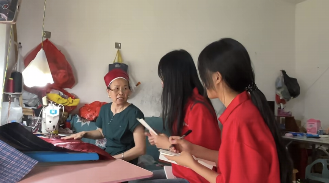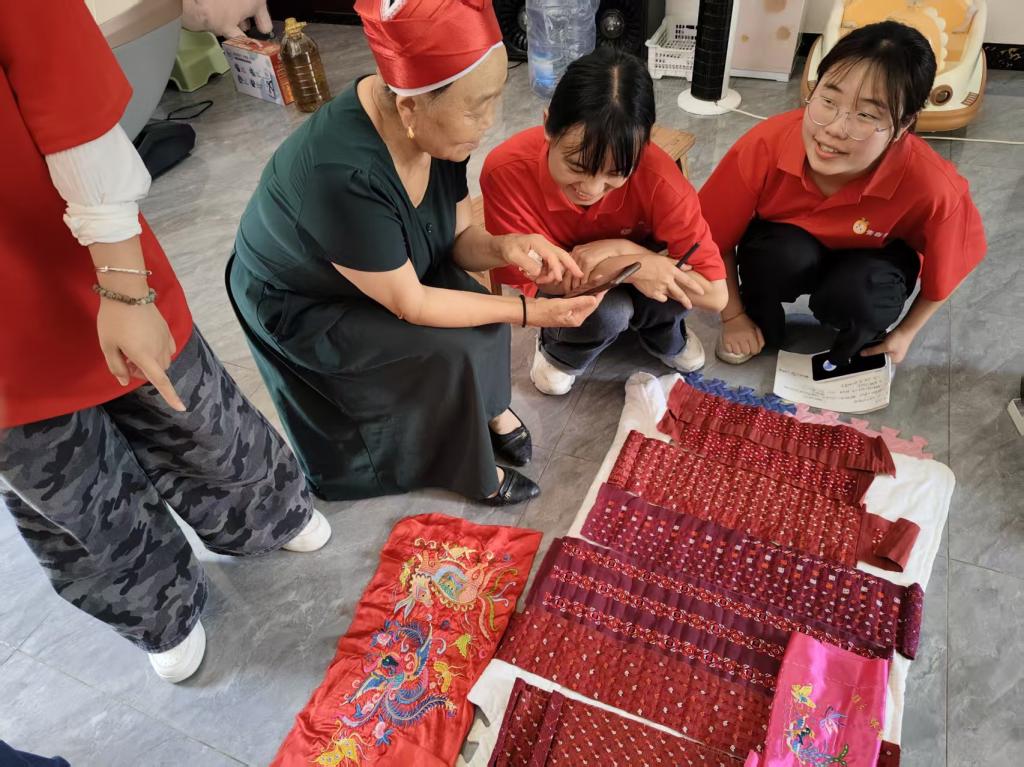 7月16日,实践队全体成员首先来到当地苗绣传承人潘阿姨家中。潘阿姨从事苗绣已有四十余年,她向志愿者们详细介绍了苗绣在苗族婚嫁、节庆等传统习俗中的重要地位。她还提到,黄平苗绣图案多取材于几何图形,黄平苗绣绣法常采用数纱绣、锁绣。实践队成员边听边记,用镜头定格下那些带着温度的绣品与故事。此外,潘阿姨还展示了她珍藏的苗衣,并热情地邀请实践队成员试穿苗衣。大家在试穿过程中, 近距离感受苗衣的刺绣工艺、服饰结构,体会苗族服饰中“以针为笔、以线为墨”的文化表达。