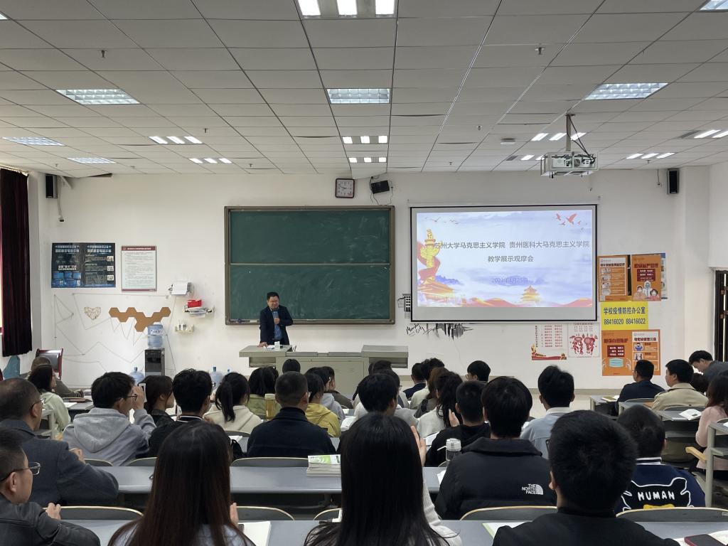 4月25日14:00-16:00,苏州大学马克思主义学院与贵州医科大学马克思主义学院在贵州医科大学南校区九思楼X4107教室联合举办教学展示观摩活动。参加观摩活动的有苏州大学马克思主义学院党委书记陈建军书记、副院长朱蓉蓉、李文娟、顾宏松、郑善文、张建晓,贵州医科大学马克思主义学院党委书记黄鑫权、副院长张才国及部分教师代表,21级思想政治教育本科专业学生50人。观摩活动由贵州医科大学马克思主义学院副院长禹辉映主持。