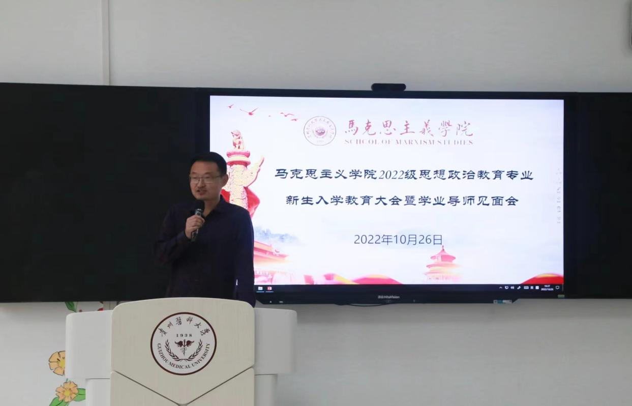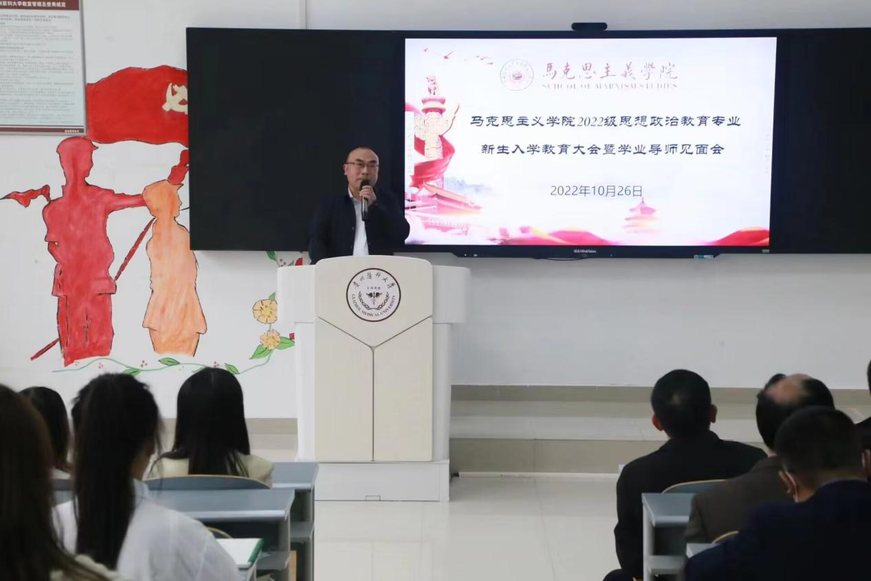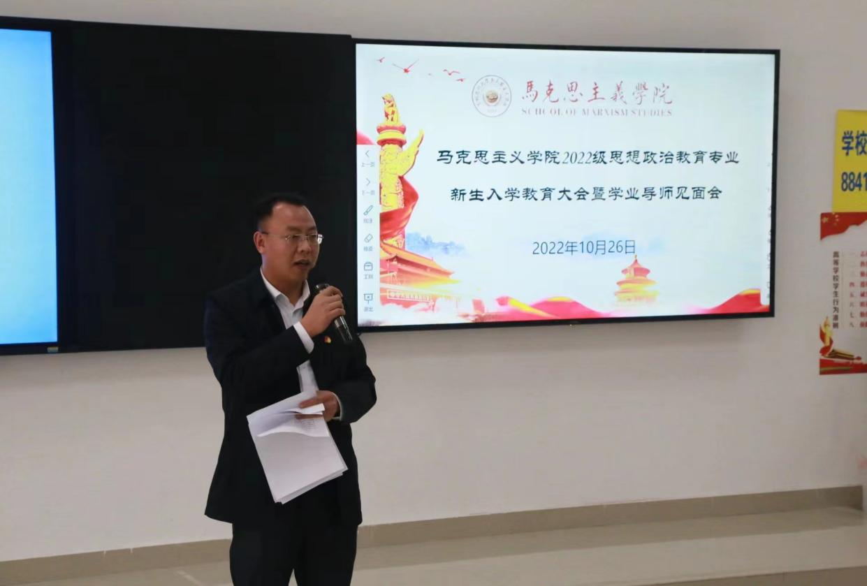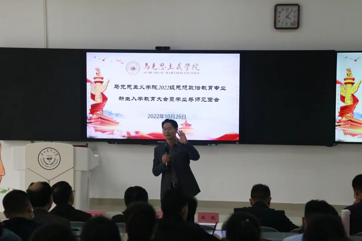 10月26日,我院在九思楼4202教室召开2022级思想政治教育专业新生入学教育大会暨学业导师见面会,学院党委全体成员、副科级以上干部(含教研室负责人)、辅导员、班主任、全体学业导师及2022级全体新生、2021级学生代表参加。会议由学院党委副书记王万江主持。