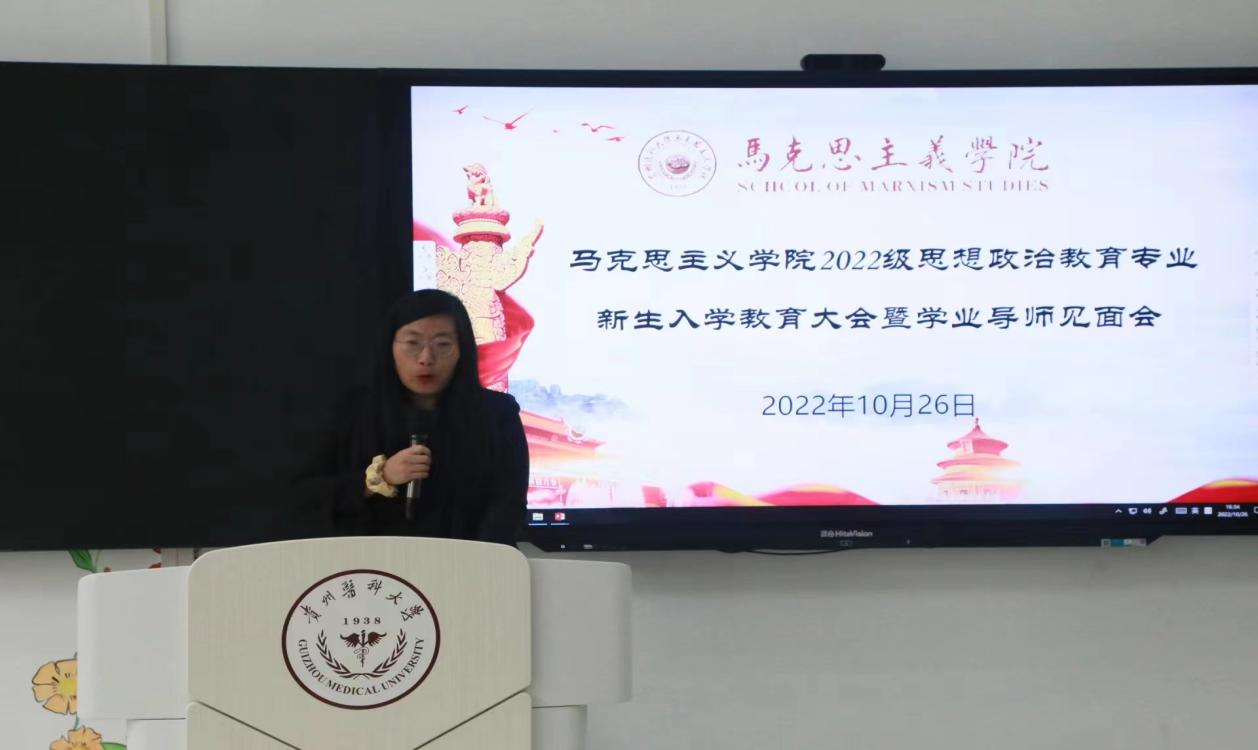 教师代表程广丽发言,她认为马克思主义理论是博大精深的理论,学习马克思主义对世界观教育非常重要,同学们选择马克思主义学院是明智的,今后要在修身、治国的同时实现个人与社会的统一。