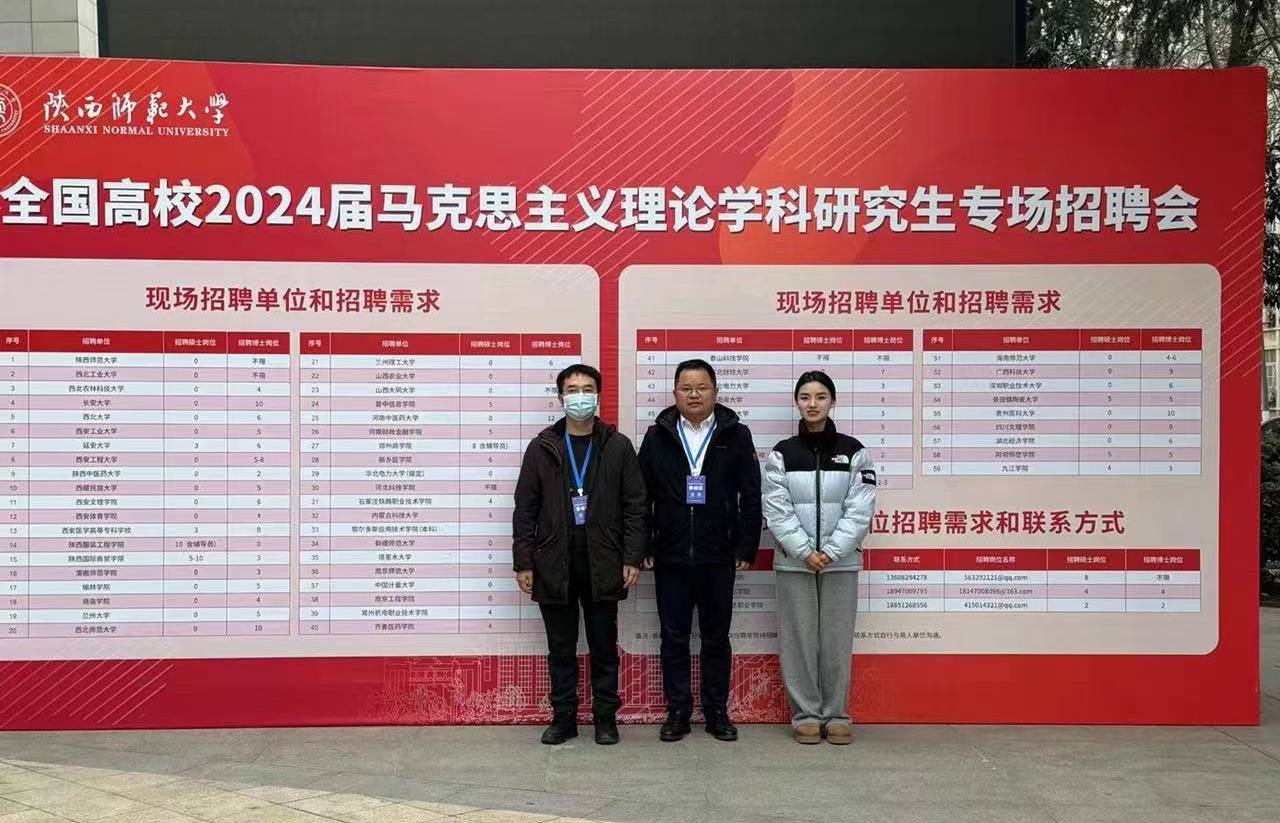 12月10日,由陕西师范大学招生就业处主办、马克思主义学院承办的全国高校2024届马克思主义理论学科研究生专场招聘会于陕西师范大学长安校区新勇学生活动中心二层多功能厅顺利举办。我院副院长禹辉映带队,陈兴明、方芳在内的3位老师参加了此次专场招聘会。