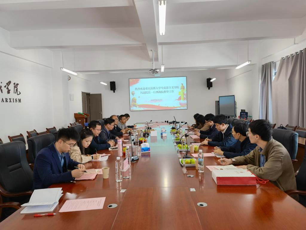 杜凯对重庆医科大学马克思主义学院来访表示欢迎。禹辉映介绍了我院的基本情况。冯磊介绍了重庆医科大学马克思主义学院的基本情况。他对我院在科研创新方面取得的成绩给予了较高评价,表示此次来访旨在深化院校间的学术交流、分享教学经验,探讨医科类院校思政课教学改革创新的新路径。郭笑雨表示,希望通过此次交流,双方能够在学术研究和人才培养等方面实现资源共享、优势互补。