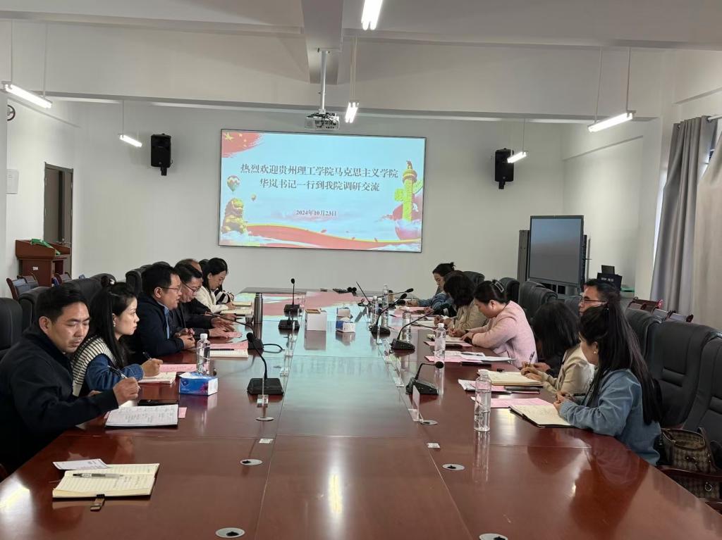 10月23日下午,贵州理工学院马克思主义学院华岚书记一行到我院调研交流,调研交流会在善思楼4楼会议室召开,贵州理工学院马克思主义学院副院长欧阳德君、杨立杰,形势与政策教研室主任孙瑞,教学科研科科长吴园园及教师代表聂祥乙、赵康琴出席。会议由我院党委书记杜凯主持,党委副书记王万江、副院长禹辉映及相关科室负责人参加。本次调研交流会围绕本科教育审核性评估工作、思政课教学改革创新工作、科研工作与党建工作展开。