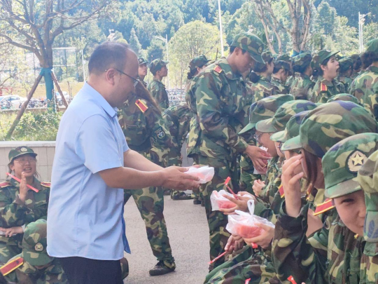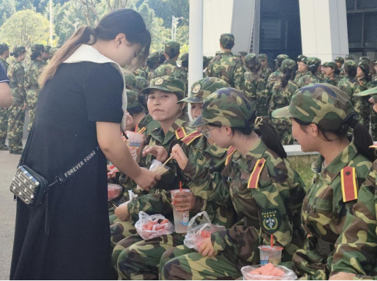 王万江详细了解学生的身心状况和受训情况,对承训教官的辛苦付出表示感谢。学院老师和学生会成员将柠檬水和西瓜分发到每一位新生手中。