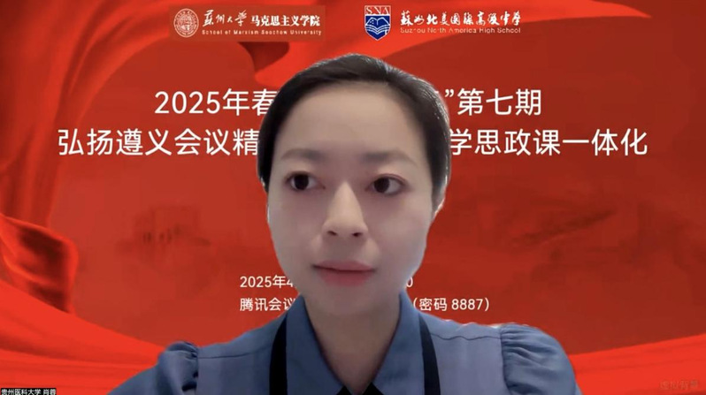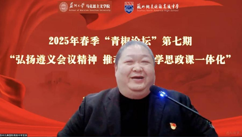 2025年4月25日,由苏州大学马克思主义学院领衔发起的第七期“青椒论坛”之“弘扬遵义会议精神,推动大中小学思政课一体化”在苏州北美国际高级中学举办。来自全国近百所大中小学及相关单位的专家学者通过线上线下相结合的方式,共商新时代思政教育创新路径,助力大中小学思政课一体化建设。会议由北美高级中学高中教学部教务处副主任何虹飞主持。我院副院长禹辉映、教师方芳、肖蓉作为主办单位代表应邀参会。