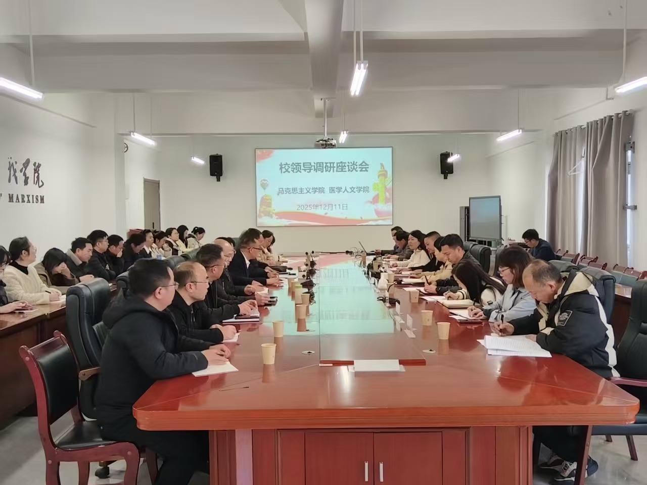 12月11日,党委副书记、校长俞松,校党委副书记张洁一行到马克思主义学院与医学人文学院围绕学院高质量发展开展调研,学校党政办公室、人事处、教务处、科学技术处、学生处、计划财务处等职能部门负责人,马克思主义学院、医学人文学院领导班子成员、副科级以上干部、教研室主任及部分教师代表参加调研座谈会,会议由校党委副书记张洁主持。