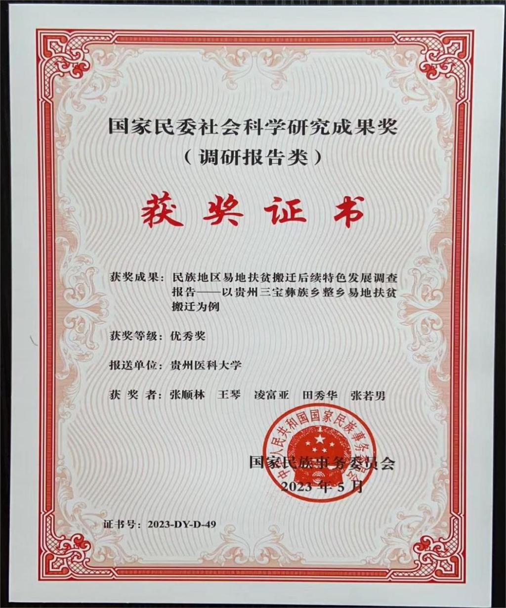 近日,国家民委办公厅通报了2022年度全国民族工作优秀调研报告评选结果。我院张顺林、王琴、凌富亚、田秀华和张若男撰写的《民族地区易地扶贫搬迁后续特色发展调查报告——以贵州三宝彝族乡整乡易地扶贫搬迁为例》荣获优秀奖。