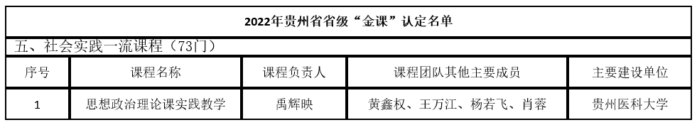近日,贵州省教育厅对2022年省级“金课”认定结果进行了公布,认定928门本科课程为2022年省级“金课”。我校48门课程获得认定,其中线上一流课程6门,虚拟仿真实验教学一流课程5门,线下一流课程8门,线上线下混合一流课程26门,社会实践一流课程3门。我院禹辉映副院长领衔申报的《思想政治理论课实践教学》课程位列其中。