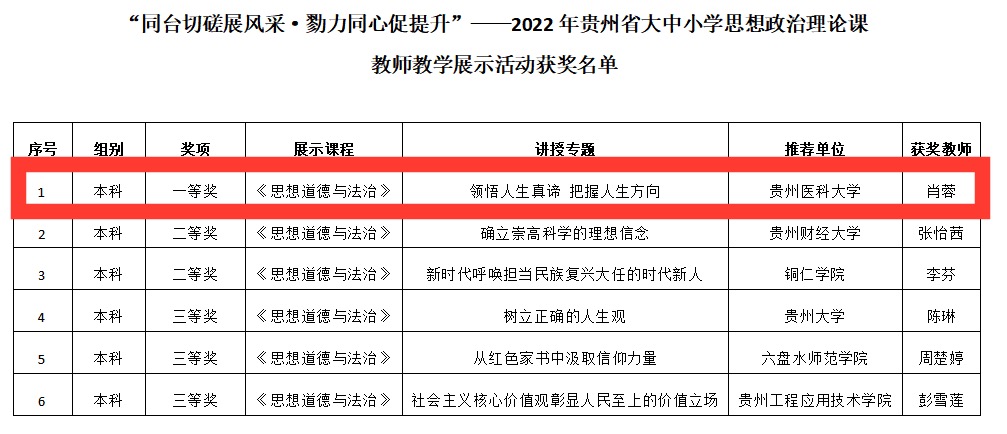 近日,省教育厅公布了“同台切磋展风采·勠力同心促提升”——2022年贵州省大中小学思想政治理论课教师教学展示活动获奖名单。我院教师肖蓉获教学展示活动《思想道德与法治》课程一等奖。