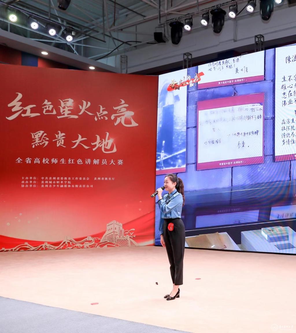 11月25日,由中共贵州省委教育工作委员会、贵州省教育厅主办,贵州城市职业学院承办的“红色星火点亮黔贵大地”全省高校师生红色讲解员大赛决赛在贵阳举行。本次大赛全省共有76所高校参加。28名选手进入决赛,其中高职院校学生组与教师组各8人,本科院校学生组与教师组各6人,大赛4个组别共评出金奖4名、银奖4名、铜奖6名、指导教师奖7名、优秀奖14名、最佳组织奖4名。我校马克思主义学院的参赛教师肖蓉参加本科院校教师组的角逐,喜获铜奖。