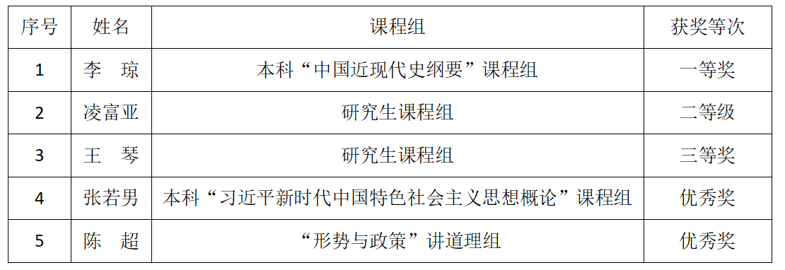 11月6日,省教育厅办公室下发了“关于公布2024年贵州省高校思想政治理论课教学大比武活动评审结果的通知”,我院5位参赛教师均获奖项,其中李琼获本科“中国近现代史纲要”课程组一等奖、凌富亚获研究生课程组二等奖、王琴获研究生课程组三等奖、张若男获本科“习近平新时代中国特色社会主义思想概论”课程组优秀奖、陈超获“形势与政策”讲道理组优秀奖。