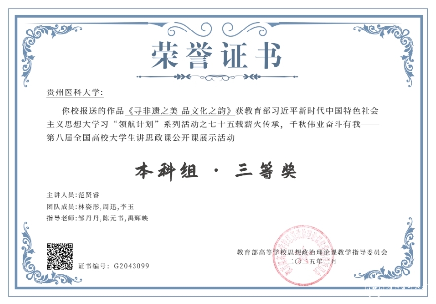 近日,教育部公布了“七十五载薪火传承,千秋伟业奋斗有我——第八届全国高校大学生讲思政课公开课展示活动”评审结果,我校报送的作品《寻非遗之美 品文化之韵》荣获三等奖。
